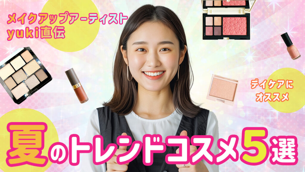 Youtubeバナー 2025 10/09 banner-work Youtubeバナー 目的 夏のトレンドコスメ5選のYoutubeへ誘導 ターゲット コスメに興味のある20−30代女性 デザイン 夏の明るさ、ポップさを表現しつつ、気軽にコスメを試したくなるわくわくをイメージしたデザイン。 制作期間 3時間 使用ツール Photoshop photoshop sample banner-work